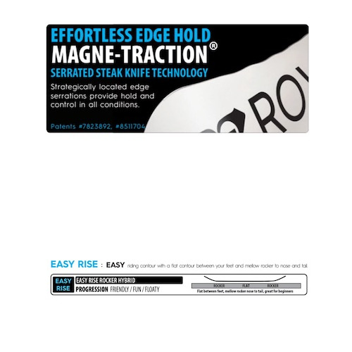 - Profilo: Il profilo Easy Rise Hybrid Rocker presenta una sezione piatta tra gli attacchi con un smooth rocker nel nose e tail. Questo design consente curve senza sforzo mantenendo la stabilità a velocità più elevate, rendendo quasi impossibile il controlamina.